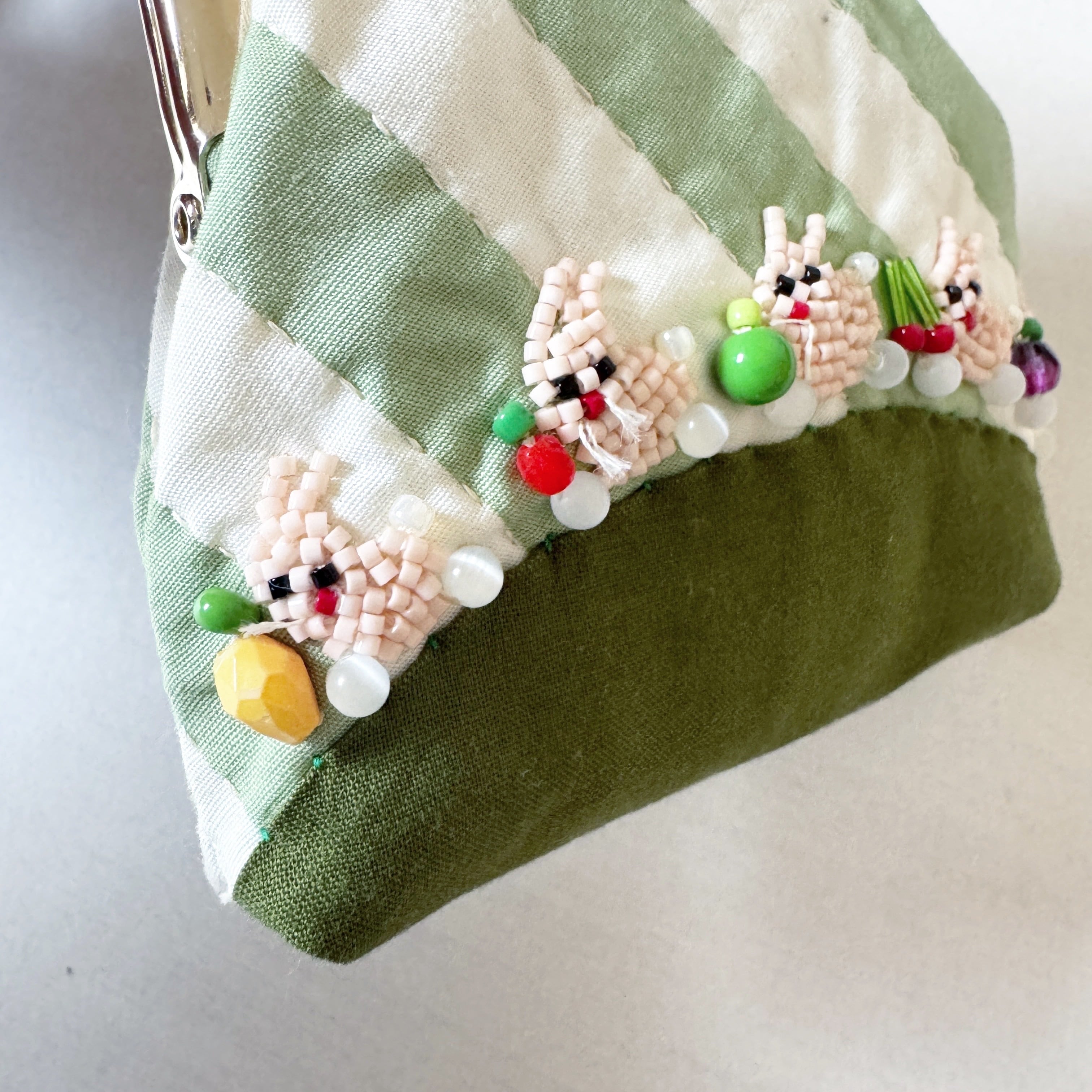 チェコビーズの可愛さって、見れば見るほどフルーツに思えてきて小さなポーチで表現できるかなと作ってみました。あしらったビーズは全てガラスビーズです。