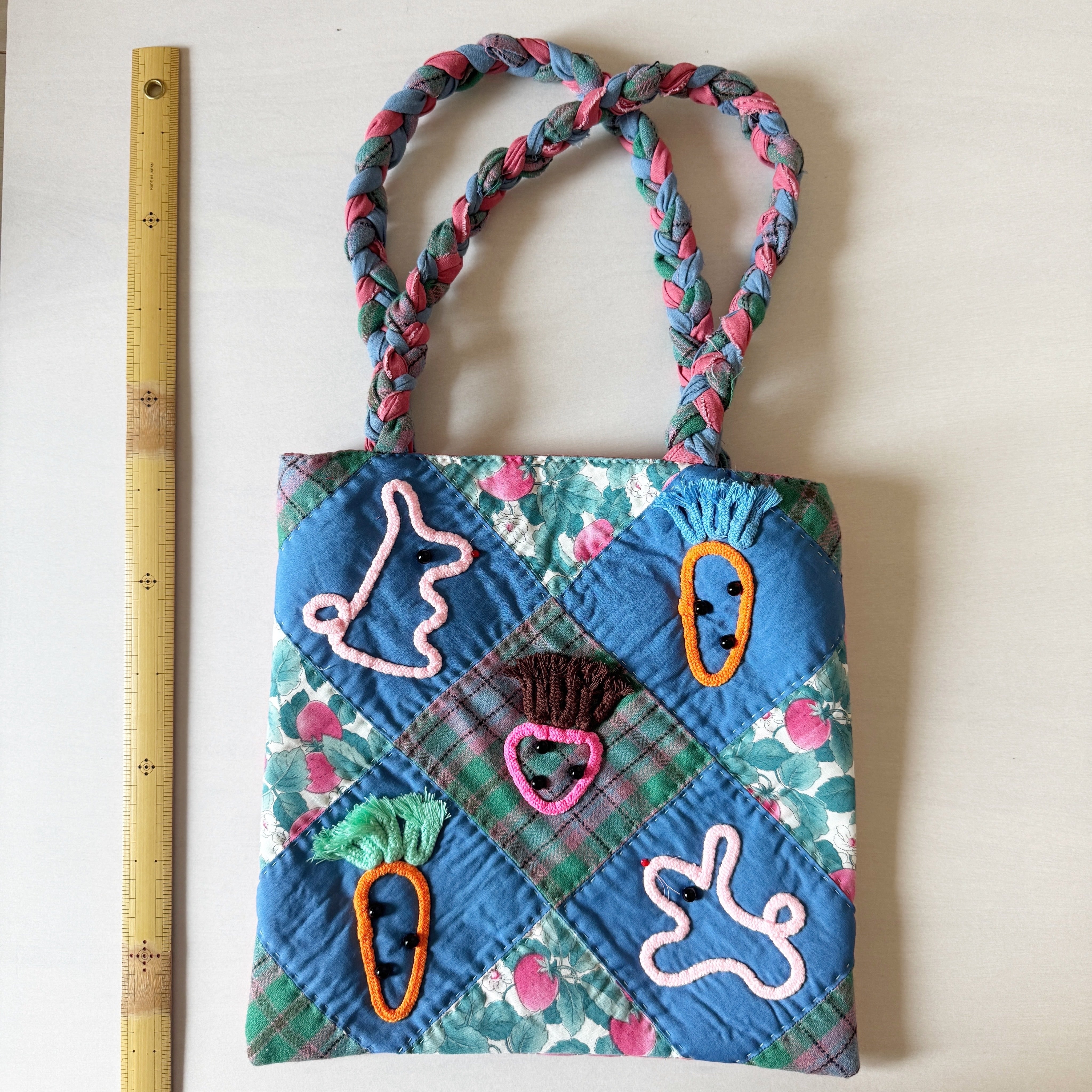 レトロ生地のパッチワークに、うさぎやにんじんのモチーフを楽しく散りばめました。