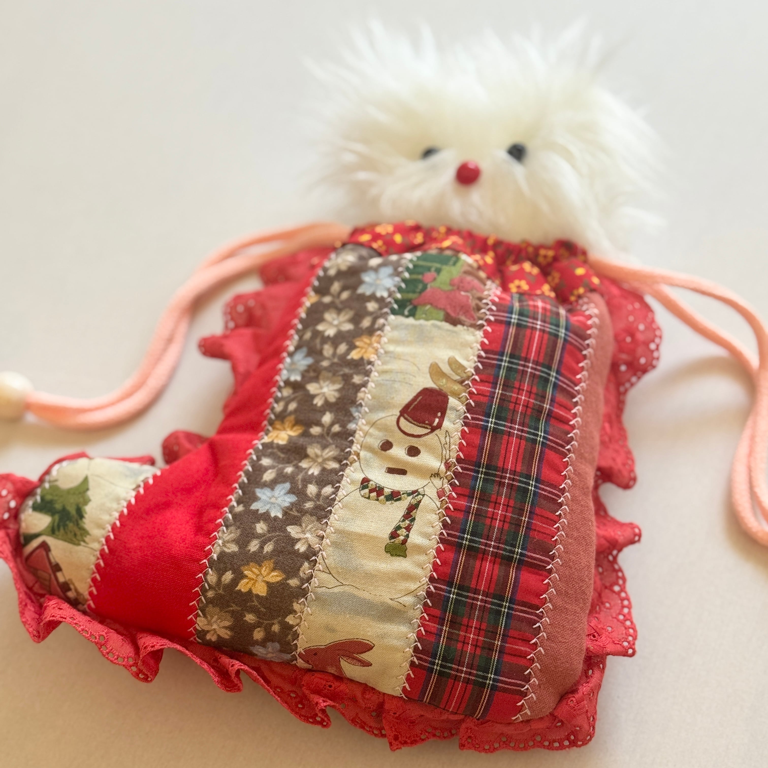 パッチワークのクリスマスストッキングに隠れることにした「ふわゆきちゃん」